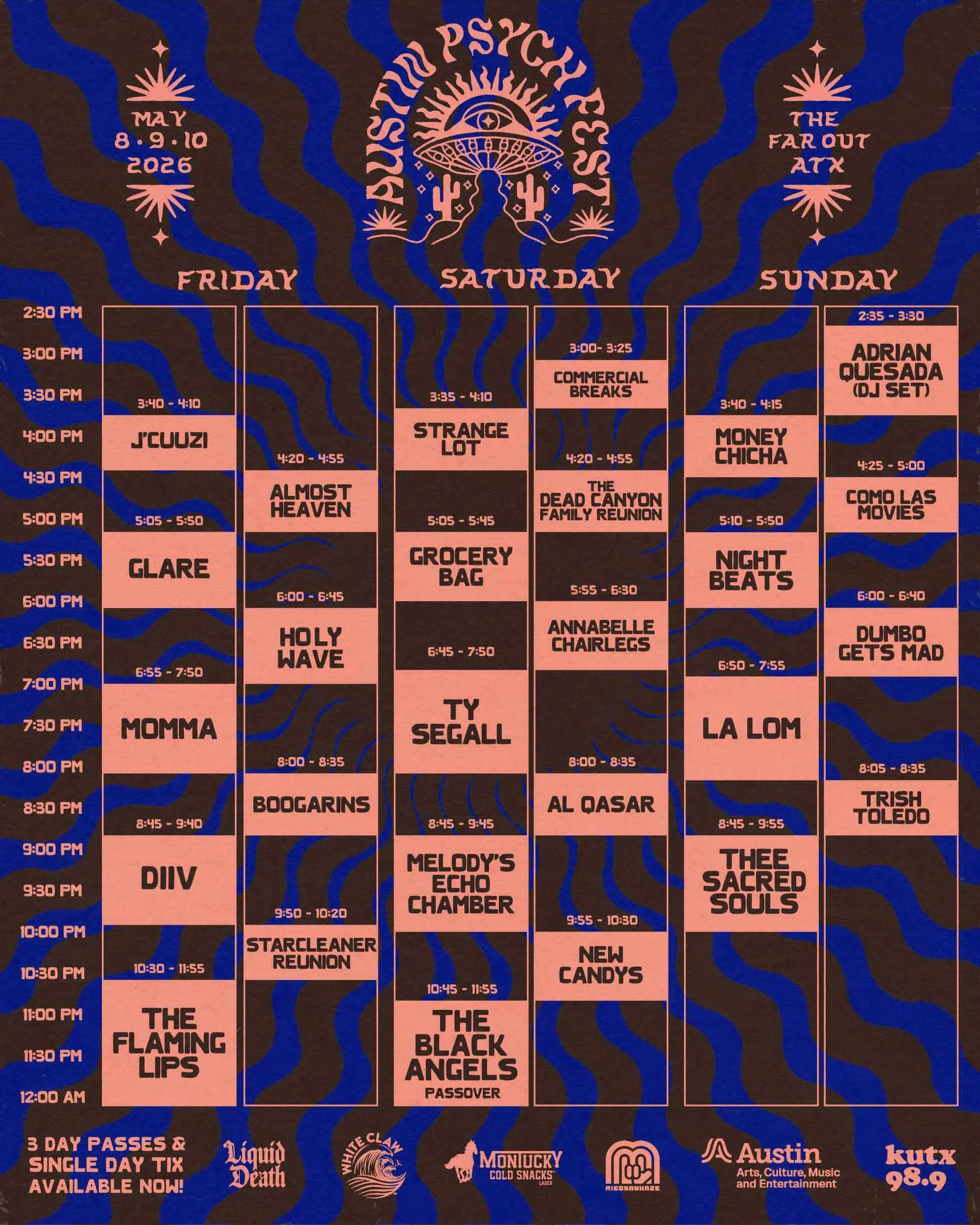 Sunday shifts away from heavy rock, offering a day filled with Cumbia, soul, R&B, and Chica bands. The day kicks off with a DJ set from Austin guitar legend Adrian Quesada, followed by Latin-psych and cumbia band Money Chicha and Los Angeles cumbia trio Lo Lom, among others. Thee Sacred Souls will close out the day with their modern take on 60s doo-wop and soul.