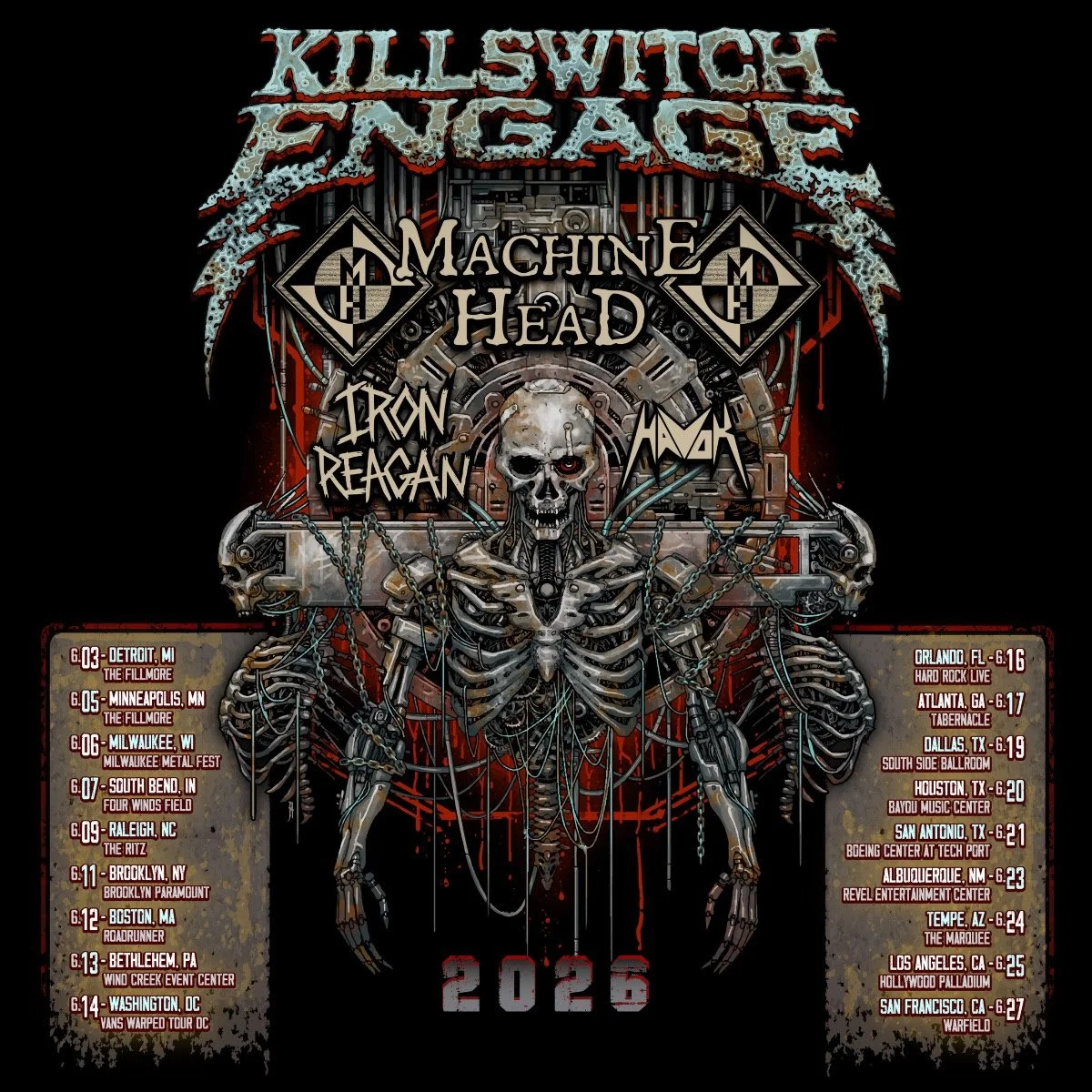 We are hitting major cities and bringing along with us an absolutely killer lineup with the legendary Robb Flynn and Machine Head, thrash masters Iron Reagan, and rounded out by the mighty Havok. This is a stacked and powerful crew of bands that will electrify and dominate wherever we roll up to... so LET'S GO!!!!!!